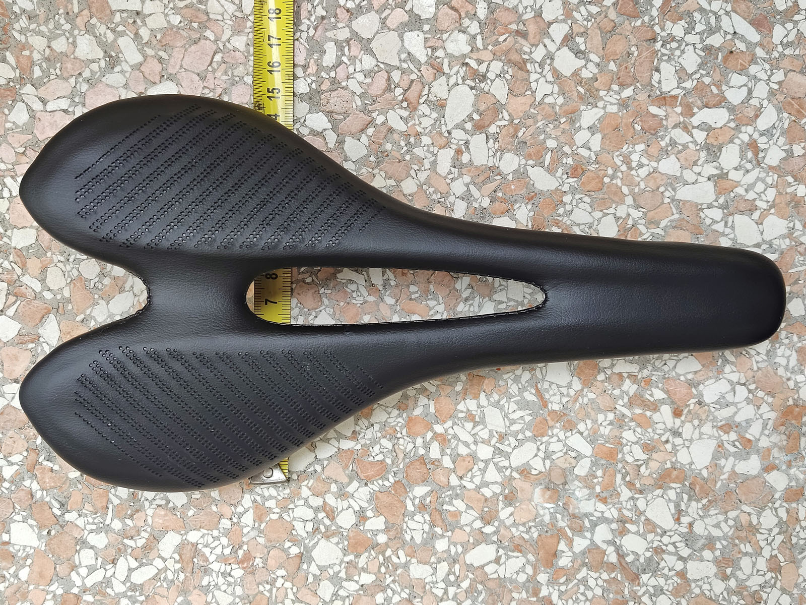 Sella Carbon Bow EVO XR Wide binari in fibra di carbonio a sezione 7x10mm Scafo in composito, con foro centrale X-Flow di scarico rivestimento in pelle sintetica termosaldata Da utilizzare su reggisella compatibili con binari a sezione ovale. peso circa 124g dimensioni della sella: 147x270mm