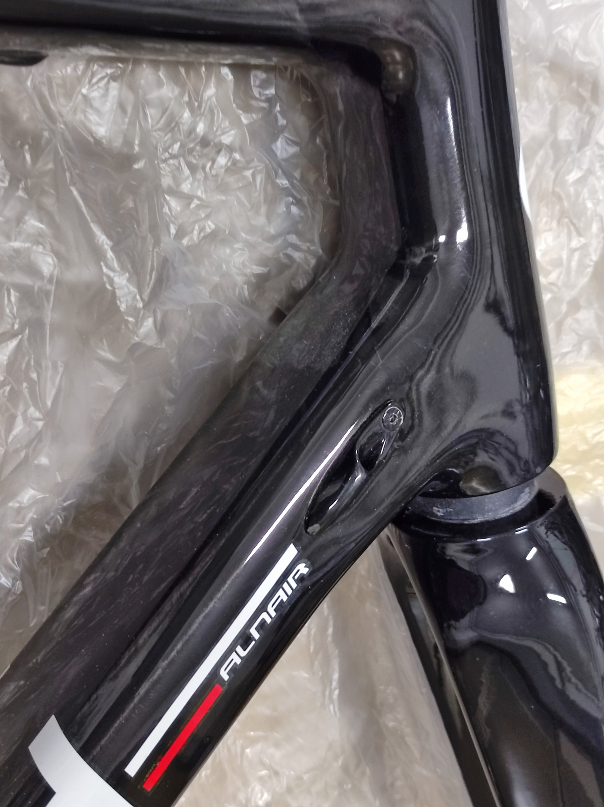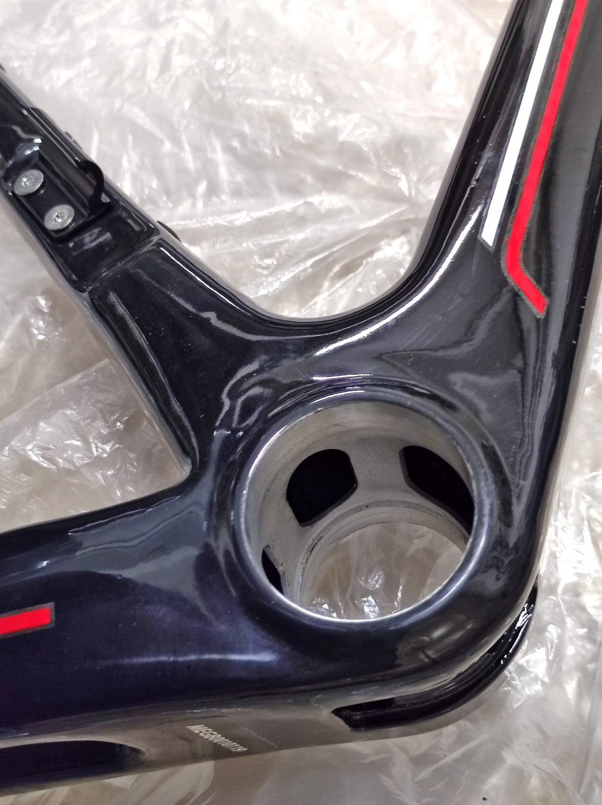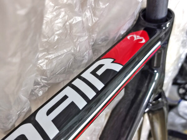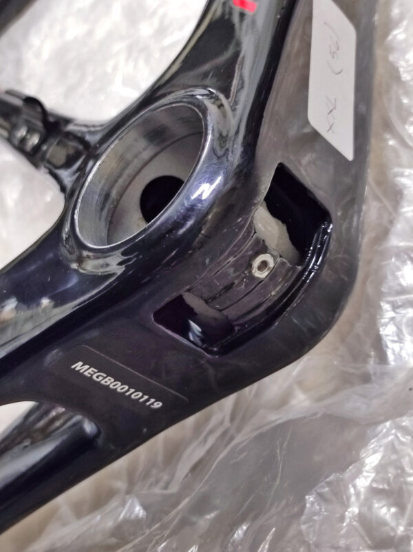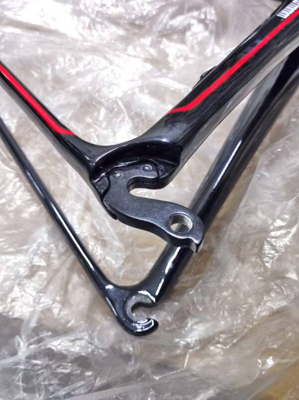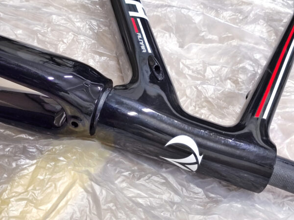 telaio marca Mathitech in fibra di carbonio alto modulo ultraleggero. Taglia 56 orizzontale x 56 tubo piantone centro movimento fine tubo (corrisponde a una XL, per altezze circa da 177 a 187) Tubo sterzo conico, scatola movimento pressfit, passaggio cavi interno, predisposto anche per gruppo elettronico. Forcella con tubo sterzo conico in carbonio. L’eccellenza del carbonio di qualità superiore.